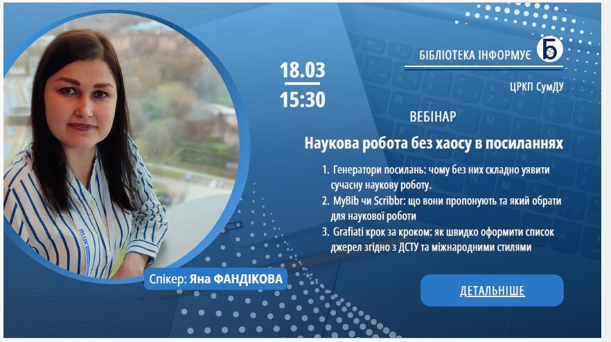 18 березня 2026 року проведено вебінар «Наукова робота без хаосу в посиланнях», в якому прийняли участь магістранти та аспіранти спеціальності А7 «Фізична культура і спорт» (спікер – Яна Фандікова). Доведена інформація щодо використання та оформлення літературних джерел у наукових виданнях за сучаними вимогами.