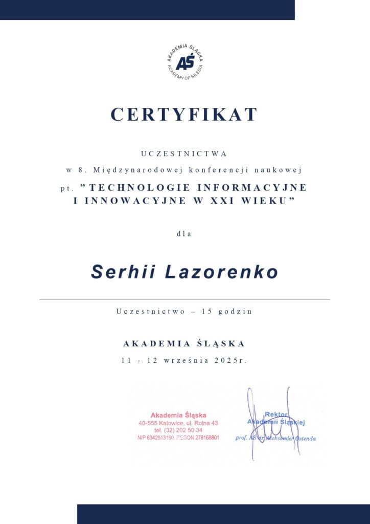 11-12 вересня 2025 року у Сілезькій академії міста Катовіце (Польща), відбулась міжнародна наукова конференція «Information and Innovation Technologies in the XXI Century». У конференції свої фахові доробки презентували науковці з більше ніж 20-ти закладів вищої освіти Польщі, України та країн Прибалтійського регіону.